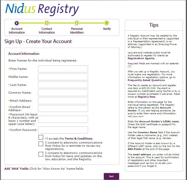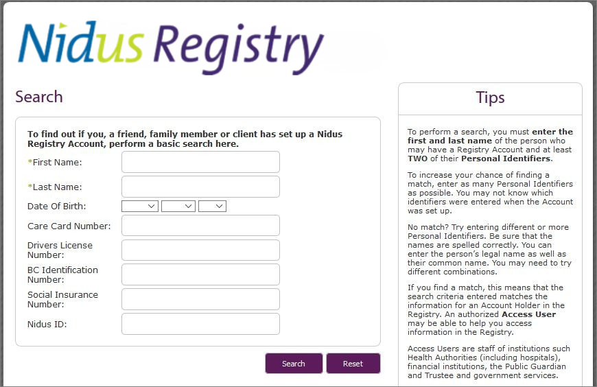 The online Nidus Registry minimizes the number of personal identifiers (such as health card number or driver’s license) required. However, there is a trade-off as the personal identifiers are used to search for a Registry Account.